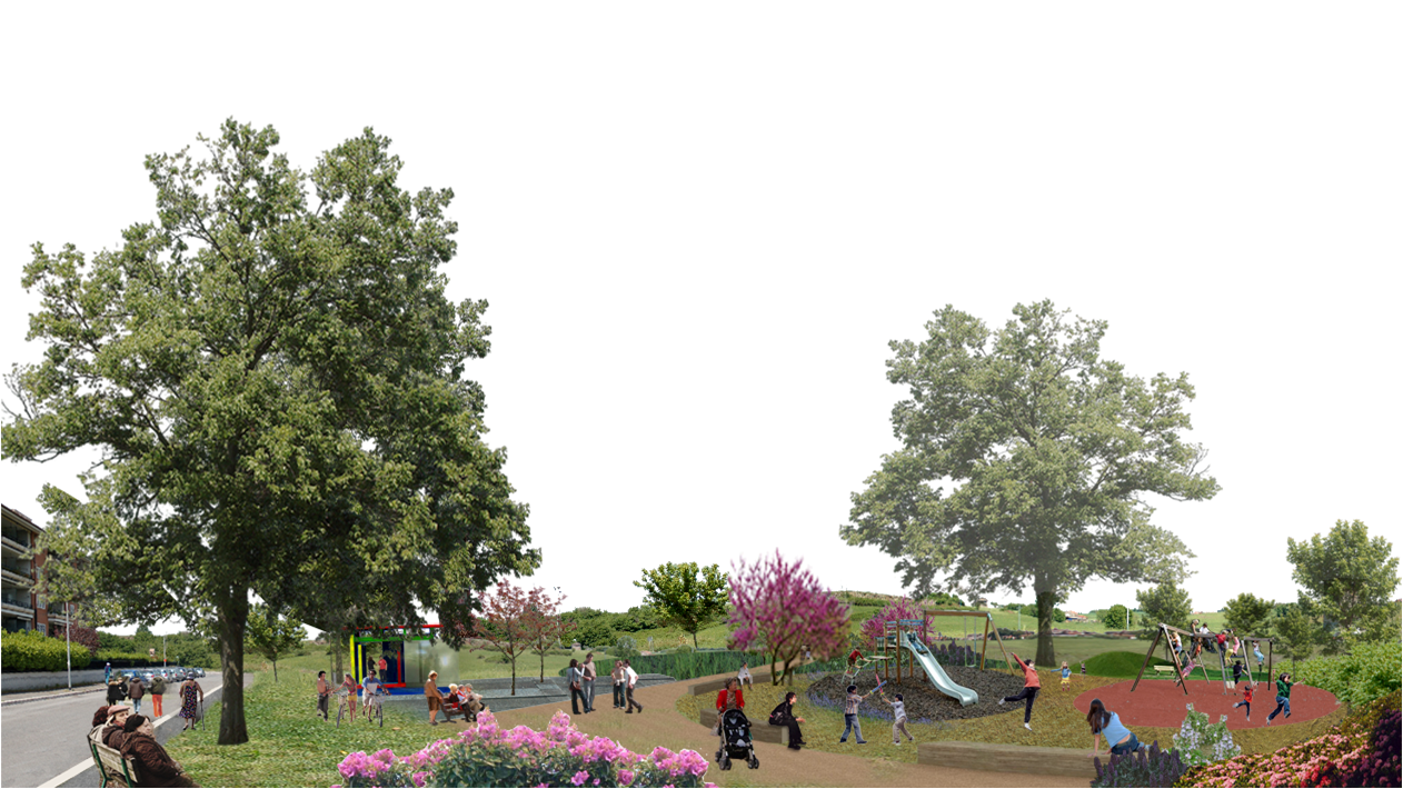 The program includes community and educational gardens, a playground, wellness paths, and open-air gymnastic areas.