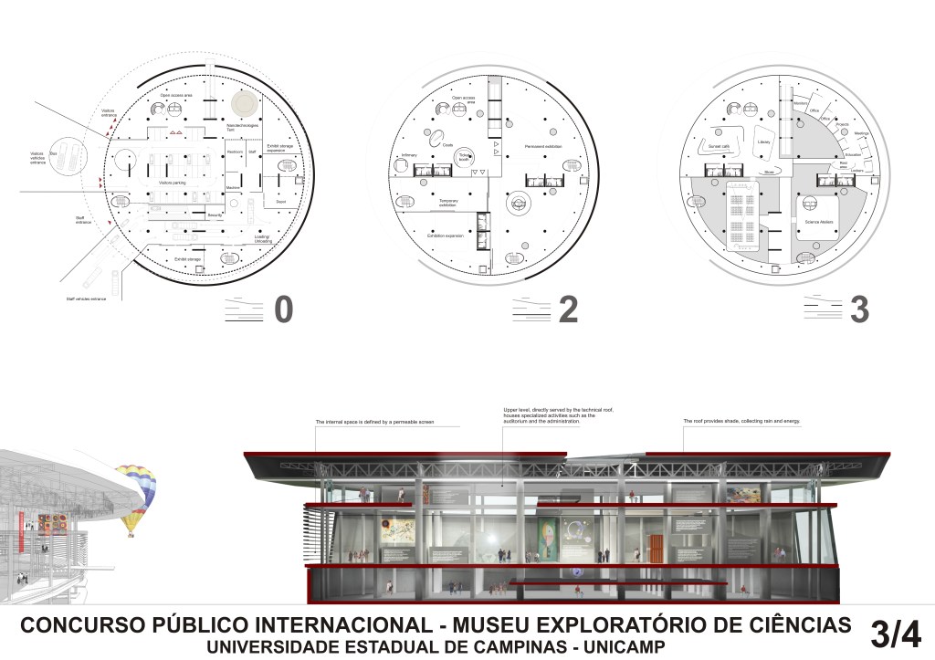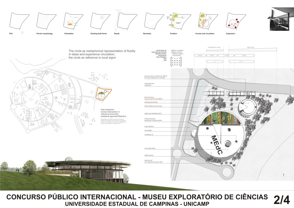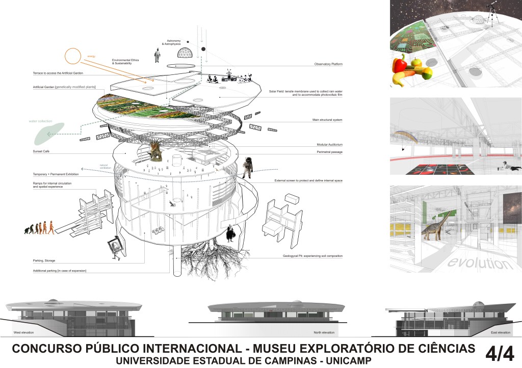 A raised platform concentrates the main exhibition spaces, while flows of water, air, energy, and people circulate freely around and beneath it. The roof acts as both garden and collector, hosting photovoltaic membranes and rainwater systems.